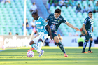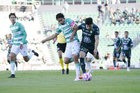 Torreón, Coahuila, 18 de octubre de 2025. Iván Moreno y Kevin Balanta, durante el partido correspondiente a la jornada 13 del torneo Apertura 2025 de la Liga BBVA MX, entre los Guerreros de Santos Laguna y los Esmeraldas del León, realizado en el estadio Corona. Foto: Imago7/Sebastian Laureano Miranda