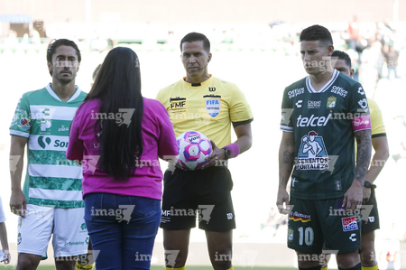 Torreón, Coahuila, 18 de octubre de 2025. Protocolo de la Campaña Rosa para la concientización del Cáncer de Mama, durante el partido correspondiente a la jornada 13 del torneo Apertura 2025 de la Liga BBVA MX, entre los Guerreros de Santos Laguna y los Esmeraldas del León, realizado en el estadio Corona. Foto: Imago7/Sebastian Laureano Miranda