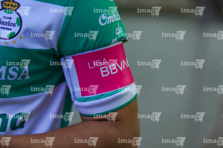 Torreón, Coahuila, 18 de octubre de 2025. Gafete de capitán de la Campaña Rosa para la concientización del Cáncer de Mama, durante el partido correspondiente a la jornada 13 del torneo Apertura 2025 de la Liga BBVA MX, entre los Guerreros de Santos Laguna y los Esmeraldas del León, realizado en el estadio Corona. Foto: Imago7 Erick Saavedra