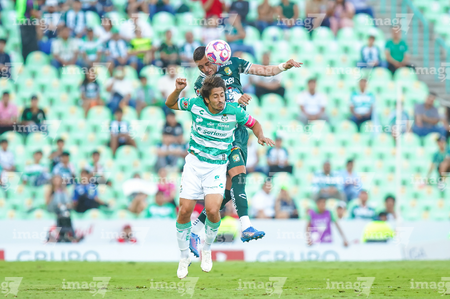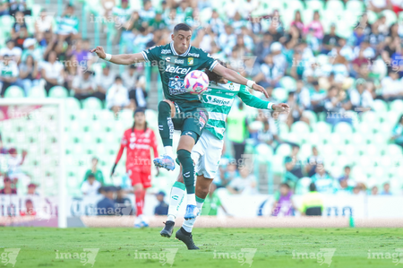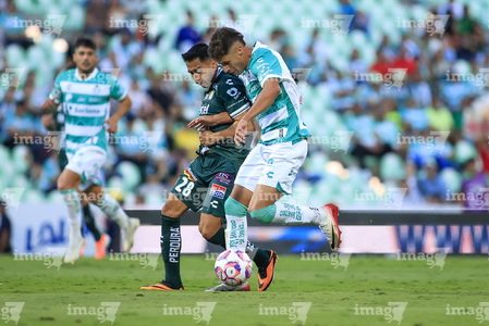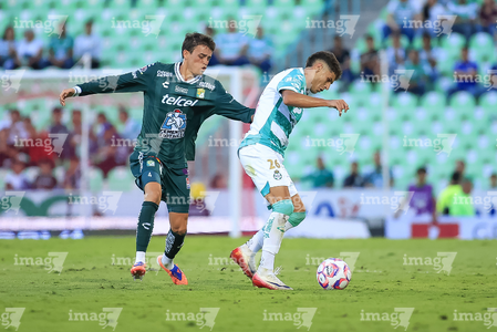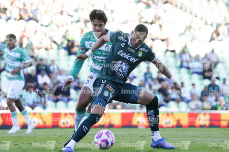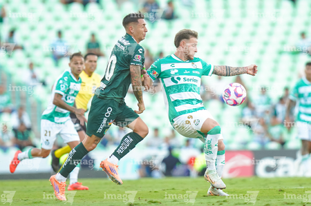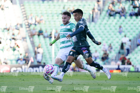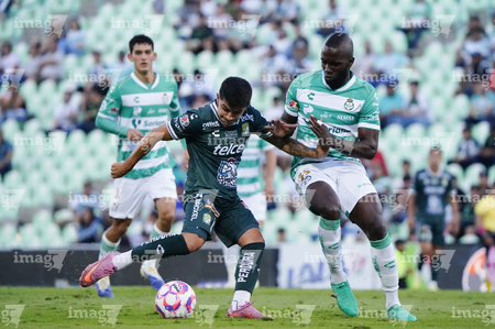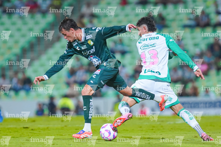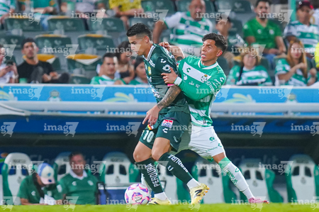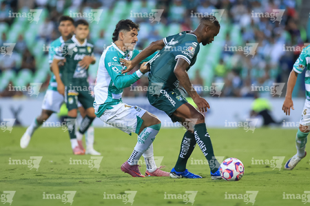 Torreón, Coahuila, 18 de octubre de 2025. Nicolás Fonseca y Jesús Ocejo, durante el partido correspondiente a la jornada 13 del torneo Apertura 2025 de la Liga BBVA MX, entre los Guerreros de Santos Laguna y los Esmeraldas del León, realizado en el estadio Corona. Foto: Imago7 Erick Saavedra