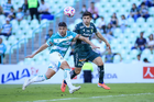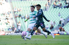 Torreón, Coahuila, 18 de octubre de 2025. José David Ramírez "El Avión" y Ramiro Sordo, durante el partido correspondiente a la jornada 13 del torneo Apertura 2025 de la Liga BBVA MX, entre los Guerreros de Santos Laguna y los Esmeraldas del León, realizado en el estadio Corona. Foto: Imago7/ Saul Perales