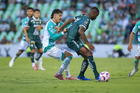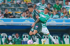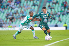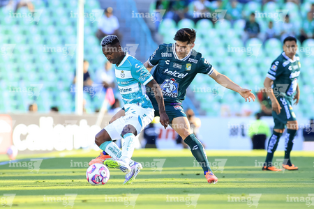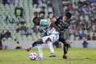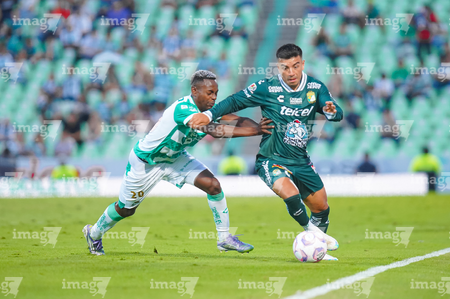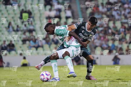 Torreón, Coahuila, 18 de octubre de 2025. Kevin Palacios y Stiven Barreiro, durante el partido correspondiente a la jornada 13 del torneo Apertura 2025 de la Liga BBVA MX, entre los Guerreros de Santos Laguna y los Esmeraldas del León, realizado en el estadio Corona. Foto: Imago7/Sebastian Laureano Miranda