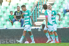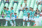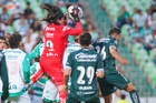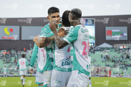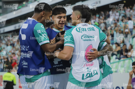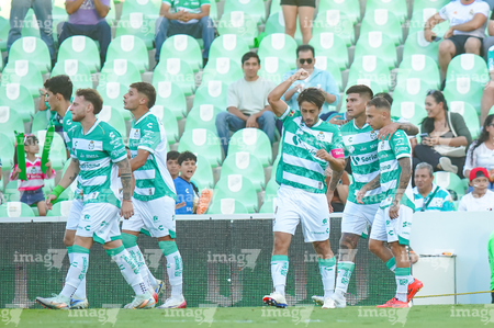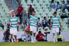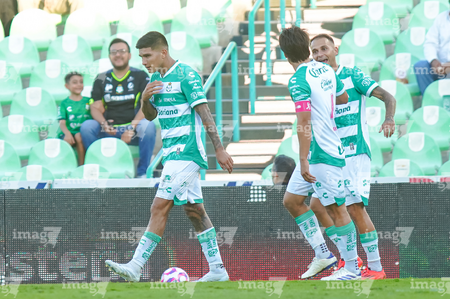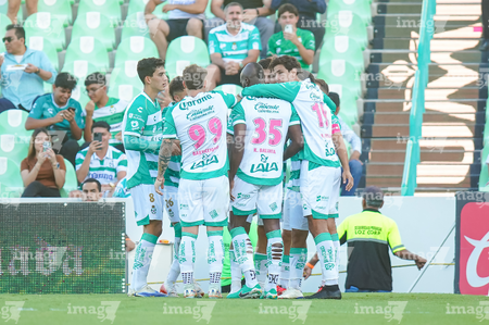 Torreón, Coahuila, 18 de octubre de 2025. Jugadores del Santos Laguna en festejo de gol, durante el partido correspondiente a la jornada 13 del torneo Apertura 2025 de la Liga BBVA MX, entre los Guerreros de Santos Laguna y los Esmeraldas del León, realizado en el estadio Corona. Foto: Imago7 Erick Saavedra