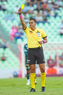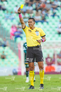 Torreón, Coahuila, 18 de octubre de 2025. Daniel Quintero Huitrón, árbitro central muestra tarjeta amarilla de amonestación, durante el partido correspondiente a la jornada 13 del torneo Apertura 2025 de la Liga BBVA MX, entre los Guerreros de Santos Laguna y los Esmeraldas del León, realizado en el estadio Corona. Foto: Imago7 Erick Saavedra