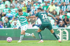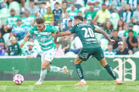 Torreón, Coahuila, 18 de octubre de 2025. Nicolás Fonseca (D), durante el partido correspondiente a la jornada 13 del torneo Apertura 2025 de la Liga BBVA MX, entre los Guerreros de Santos Laguna y los Esmeraldas del León, realizado en el estadio Corona. Foto: Imago7/ Saul Perales