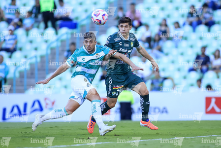Torreón, Coahuila, 18 de octubre de 2025. Rodrigo Echeverría y Bruno Barticciotto, durante el partido correspondiente a la jornada 13 del torneo Apertura 2025 de la Liga BBVA MX, entre los Guerreros de Santos Laguna y los Esmeraldas del León, realizado en el estadio Corona. Foto: Imago7 Erick Saavedra