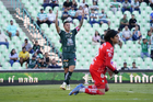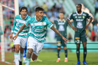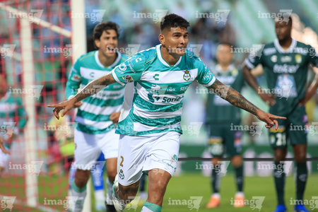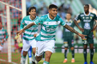 Torreón, Coahuila, 18 de octubre de 2025. Carlos Acevedo en festejo, durante el partido correspondiente a la jornada 13 del torneo Apertura 2025 de la Liga BBVA MX, entre los Guerreros de Santos Laguna y los Esmeraldas del León, realizado en el estadio Corona. Foto: Imago7/Sebastian Laureano Miranda