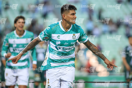 Torreón, Coahuila, 18 de octubre de 2025. Bruno Amione en festejo de gol, durante el partido correspondiente a la jornada 13 del torneo Apertura 2025 de la Liga BBVA MX, entre los Guerreros de Santos Laguna y los Esmeraldas del León, realizado en el estadio Corona. Foto: Imago7/ Saul Perales