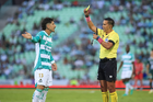 Torreón, Coahuila, 18 de octubre de 2025. Daniel Quintero Huitrón, árbitro central muestra tarjeta amarilla de amonestación a Jesús Ocejo, durante el partido correspondiente a la jornada 13 del torneo Apertura 2025 de la Liga BBVA MX, entre los Guerreros de Santos Laguna y los Esmeraldas del León, realizado en el estadio Corona. Foto: Imago7/ Saul Perales