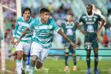 Torreón, Coahuila, 18 de octubre de 2025. Bruno Amione en festejo de gol, durante el partido correspondiente a la jornada 13 del torneo Apertura 2025 de la Liga BBVA MX, entre los Guerreros de Santos Laguna y los Esmeraldas del León, realizado en el estadio Corona. Foto: Imago7 Erick Saavedra