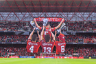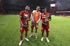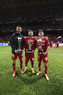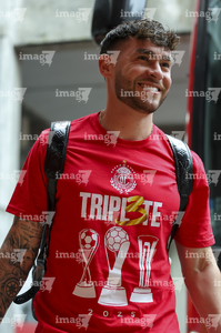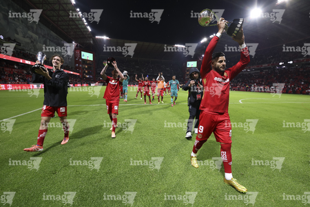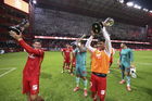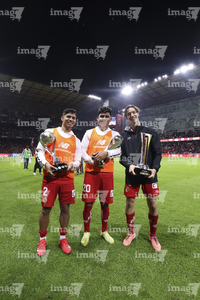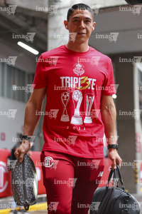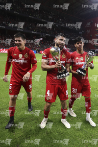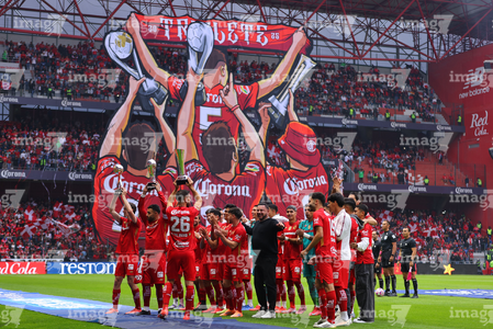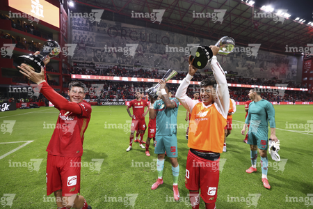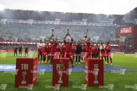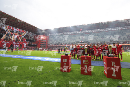Toluca, Estado de México, 18 de octubre de 2025. Jugadores del Toluca con trofeos, durante el partido correspondiente a la jornada 13 del torneo Apertura 2025 de la Liga BBVA MX, entre los Diablos Rojos del Toluca y los Gallos Blancos del Querétaro, realizado en el estadio Nemesio Diez. Foto: Imago7/ Rafael Vadillo
