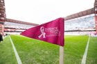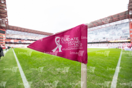 Toluca, Estado de México, 18 de octubre de 2025. Banderin de tiro de esquina de la Campaña Rosa para la concientización del Cáncer de Mama, durante el partido correspondiente a la jornada 13 del torneo Apertura 2025 de la Liga BBVA MX, entre los Diablos Rojos del Toluca y Club Querétaro, realizado en el estadio Nemesio Diez. Foto: Imago7/ Daniel Arriaga