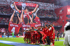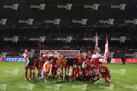 Toluca, Estado de México, 18 de octubre de 2025. Foto de equipo de Toluca con trofeos y tifo, durante el partido correspondiente a la jornada 13 del torneo Apertura 2025 de la Liga BBVA MX, entre los Diablos Rojos del Toluca y los Gallos Blancos del Querétaro, realizado en el estadio Nemesio Diez. Foto: Imago7/ Rafael Vadillo