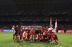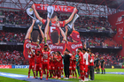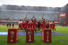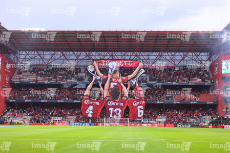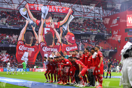 Toluca, Estado de México, 18 de octubre de 2025. Jugadores del Toluca con tifo y trofeos de campeones, durante el partido correspondiente a la jornada 13 del torneo Apertura 2025 de la Liga BBVA MX, entre los Diablos Rojos del Toluca y los Gallos Blancos del Querétaro, realizado en el estadio Nemesio Diez. Foto: Imago7/ Jesús Esquivel