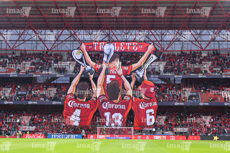 Toluca, Estado de México, 18 de octubre de 2025. Foto de equipo de Toluca con Tifo, durante el partido correspondiente a la jornada 13 del torneo Apertura 2025 de la Liga BBVA MX, entre los Diablos Rojos del Toluca y los Gallos Blancos del Querétaro, realizado en el estadio Nemesio Diez. Foto: Imago7/ Jesús Esquivel