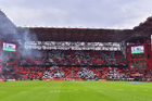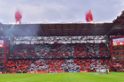 Toluca, Estado de México, 18 de octubre de 2025. Tifo y mosaico, durante el partido correspondiente a la jornada 13 del torneo Apertura 2025 de la Liga BBVA MX, entre los Diablos Rojos del Toluca y Club Querétaro, realizado en el estadio Nemesio Diez. Foto: Imago7/ Daniel Arriaga