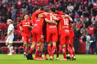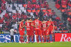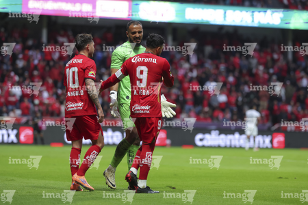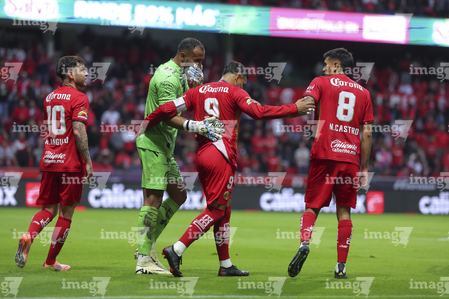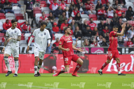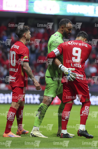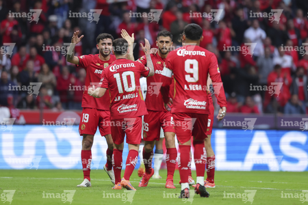 Toluca, Estado de México, 18 de octubre de 2025. Jugadores del Toluca , durante el partido correspondiente a la jornada 13 del torneo Apertura 2025 de la Liga BBVA MX, entre los Diablos Rojos del Toluca y los Gallos Blancos del Querétaro, realizado en el estadio Nemesio Diez. Foto: Imago7/ Arturo Hernandez