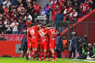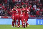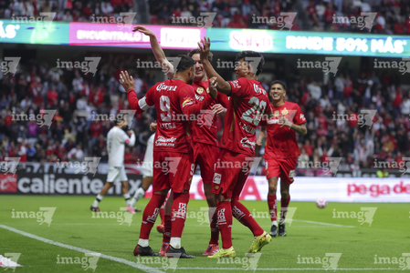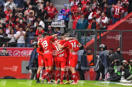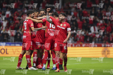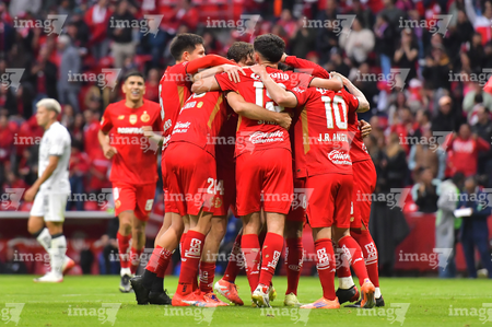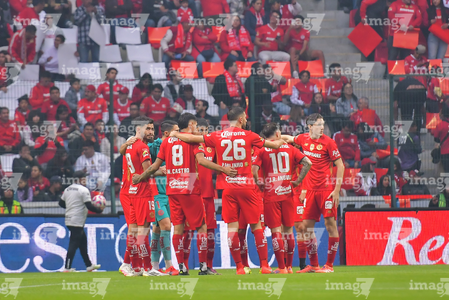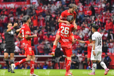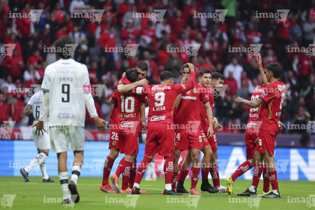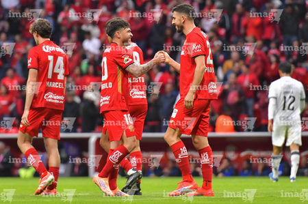 Toluca, Estado de México, 18 de octubre de 2025. Jugadores del Toluca en festejo de gol, durante el partido correspondiente a la jornada 13 del torneo Apertura 2025 de la Liga BBVA MX, entre los Diablos Rojos del Toluca y los Gallos Blancos del Querétaro, realizado en el estadio Nemesio Diez. Foto: Imago7/ Rafael Vadillo