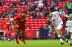 Toluca, Estado de México, 18 de octubre de 2025. Diego Reyes y Jesús Angulo "Canelo", durante el partido correspondiente a la jornada 13 del torneo Apertura 2025 de la Liga BBVA MX, entre los Diablos Rojos del Toluca y los Gallos Blancos del Querétaro, realizado en el estadio Nemesio Diez. Foto: Imago7/ Jesús Esquivel