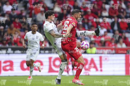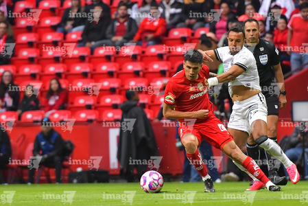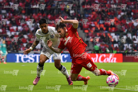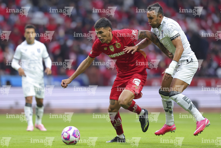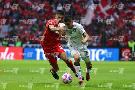 Toluca, Estado de México, 18 de octubre de 2025. Franco Romero y Marcel Ruiz, durante el partido correspondiente a la jornada 13 del torneo Apertura 2025 de la Liga BBVA MX, entre los Diablos Rojos del Toluca y los Gallos Blancos del Querétaro, realizado en el estadio Nemesio Diez. Foto: Imago7/ Rafael Vadillo