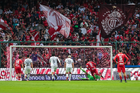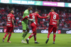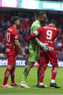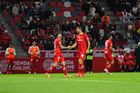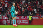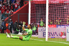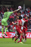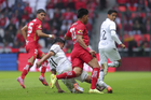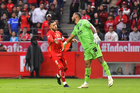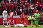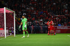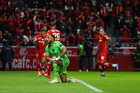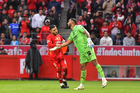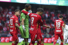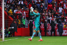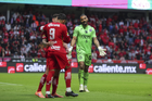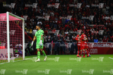 Toluca, Estado de México, 18 de octubre de 2025. Guillermo Allison recibe gol, durante el partido correspondiente a la jornada 13 del torneo Apertura 2025 de la Liga BBVA MX, entre los Diablos Rojos del Toluca y los Gallos Blancos del Querétaro, realizado en el estadio Nemesio Diez. Foto: Imago7/ Arturo Hernandez
