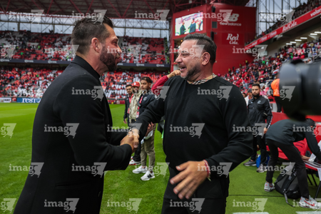 Toluca, Estado de México, 18 de octubre de 2025. Benjamín Mora, director técnico y Antonio Mohamed "Turco", director Técnico, durante el partido correspondiente a la jornada 13 del torneo Apertura 2025 de la Liga BBVA MX, entre los Diablos Rojos del Toluca y Club Querétaro, realizado en el estadio Nemesio Diez. Foto: Imago7/ Daniel Arriaga
