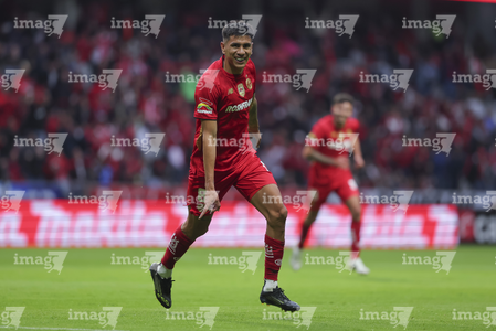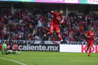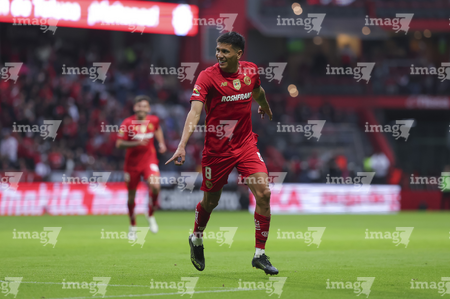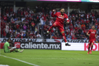 Toluca, Estado de México, 18 de octubre de 2025. Alexis Vega en festejo, durante el partido correspondiente a la jornada 13 del torneo Apertura 2025 de la Liga BBVA MX, entre los Diablos Rojos del Toluca y los Gallos Blancos del Querétaro, realizado en el estadio Nemesio Diez. Foto: Imago7/ Jesús Esquivel
