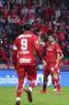 Toluca, Estado de México, 18 de octubre de 2025. Paulinho y Jesús Angulo "Canelo" en festejo de gol, durante el partido correspondiente a la jornada 13 del torneo Apertura 2025 de la Liga BBVA MX, entre los Diablos Rojos del Toluca y los Gallos Blancos del Querétaro, realizado en el estadio Nemesio Diez. Foto: Imago7/ Rafael Vadillo