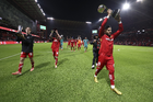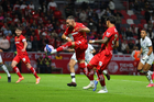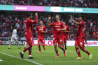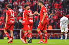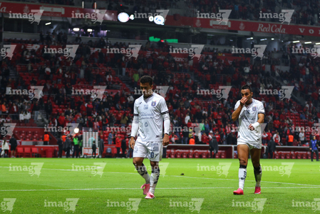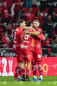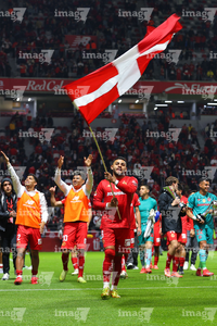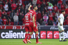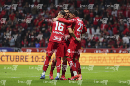 Toluca, Estado de México, 18 de octubre de 2025. Franco Romero y Héctor Herrera en festejo, durante el partido correspondiente a la jornada 13 del torneo Apertura 2025 de la Liga BBVA MX, entre los Diablos Rojos del Toluca y Club Querétaro, realizado en el estadio Nemesio Diez. Foto: Imago7/ Daniel Arriaga