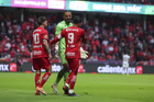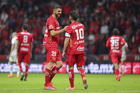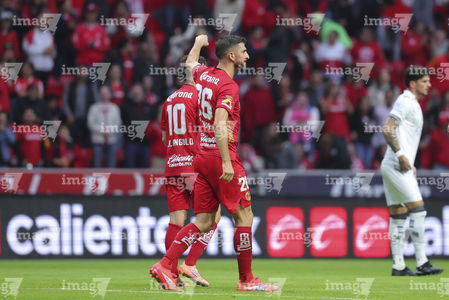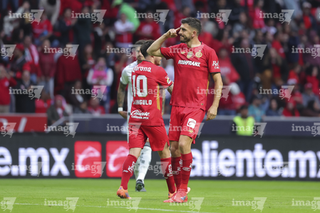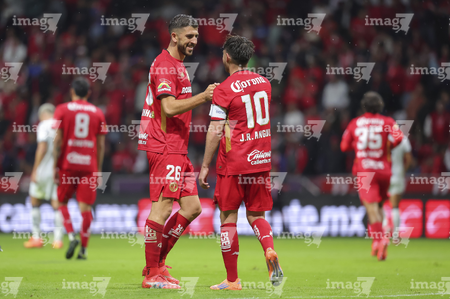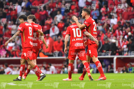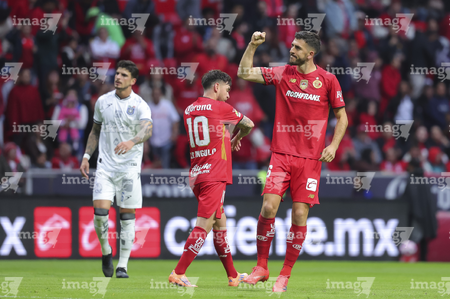 Toluca, Estado de México, 18 de octubre de 2025. Jesús Angulo "Canelo" y Alexis Vega en festejo de gol, durante el partido correspondiente a la jornada 13 del torneo Apertura 2025 de la Liga BBVA MX, entre los Diablos Rojos del Toluca y los Gallos Blancos del Querétaro, realizado en el estadio Nemesio Diez. Foto: Imago7/ Jesús Esquivel