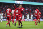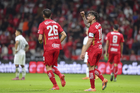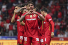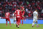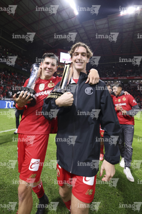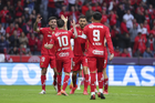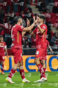 Toluca, Estado de México, 18 de octubre de 2025. Bruno Mendez y Santiago Simón en festejo, durante el partido correspondiente a la jornada 13 del torneo Apertura 2025 de la Liga BBVA MX, entre los Diablos Rojos del Toluca y Club Querétaro, realizado en el estadio Nemesio Diez. Foto: Imago7/ Daniel Arriaga
