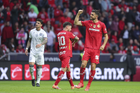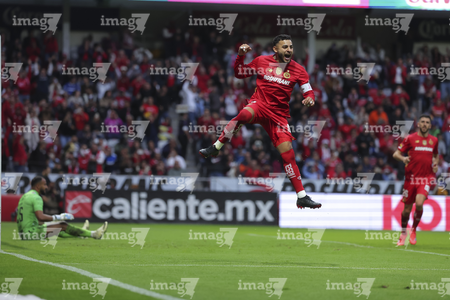 Toluca, Estado de México, 18 de octubre de 2025. Alexis Vega en festejo de gol , durante el partido correspondiente a la jornada 13 del torneo Apertura 2025 de la Liga BBVA MX, entre los Diablos Rojos del Toluca y los Gallos Blancos del Querétaro, realizado en el estadio Nemesio Diez. Foto: Imago7/ Arturo Hernandez