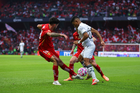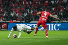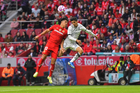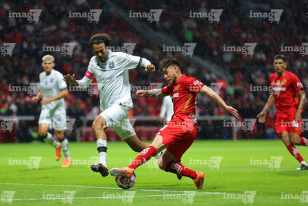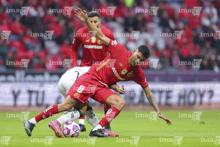 Toluca, Estado de México, 18 de octubre de 2025. Paulinho y Diego Reyes, durante el partido correspondiente a la jornada 13 del torneo Apertura 2025 de la Liga BBVA MX, entre los Diablos Rojos del Toluca y los Gallos Blancos del Querétaro, realizado en el estadio Nemesio Diez. Foto: Imago7/ Arturo Hernandez