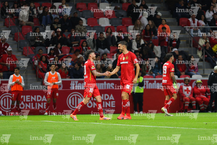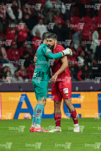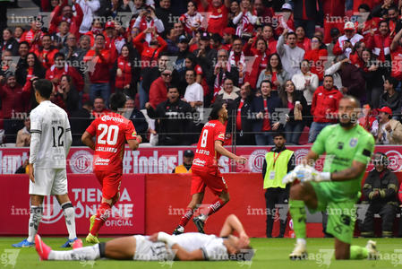 Toluca, Estado de México, 18 de octubre de 2025. Hugo González y Bruno Mendez en festejo, durante el partido correspondiente a la jornada 13 del torneo Apertura 2025 de la Liga BBVA MX, entre los Diablos Rojos del Toluca y Club Querétaro, realizado en el estadio Nemesio Diez. Foto: Imago7/ Daniel Arriaga