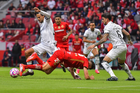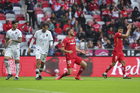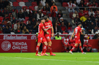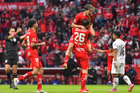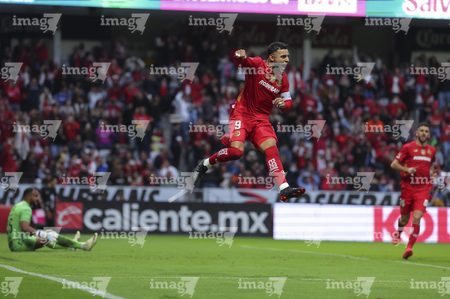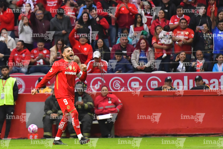 Toluca, Estado de México, 18 de octubre de 2025. Jesús Angulo "Canelo" anota gol, durante el partido correspondiente a la jornada 13 del torneo Apertura 2025 de la Liga BBVA MX, entre los Diablos Rojos del Toluca y los Gallos Blancos del Querétaro, realizado en el estadio Nemesio Diez. Foto: Imago7/ Rafael Vadillo