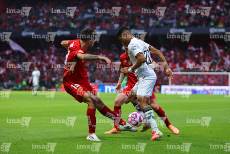 Toluca, Estado de México, 18 de octubre de 2025. Rodrigo Bogarin y Everardo López, durante el partido correspondiente a la jornada 13 del torneo Apertura 2025 de la Liga BBVA MX, entre los Diablos Rojos del Toluca y Club Querétaro, realizado en el estadio Nemesio Diez. Foto: Imago7/ Daniel Arriaga