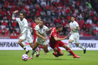 Toluca, Estado de México, 18 de octubre de 2025. Diego Reyes , Paulinho y Santiago Homenchenko , durante el partido correspondiente a la jornada 13 del torneo Apertura 2025 de la Liga BBVA MX, entre los Diablos Rojos del Toluca y los Gallos Blancos del Querétaro, realizado en el estadio Nemesio Diez. Foto: Imago7/ Arturo Hernandez
