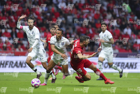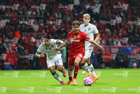 Toluca, Estado de México, 18 de octubre de 2025. Marcel Ruiz, Jesús Angulo "Canelo" y Alexis Vega, durante el partido correspondiente a la jornada 13 del torneo Apertura 2025 de la Liga BBVA MX, entre los Diablos Rojos del Toluca y los Gallos Blancos del Querétaro, realizado en el estadio Nemesio Diez. Foto: Imago7/ Rafael Vadillo