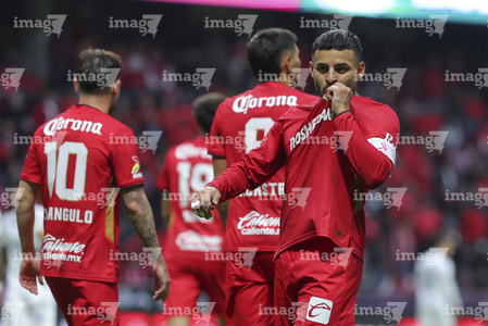 Toluca, Estado de México, 18 de octubre de 2025. Alexis Vega en festejo de gol, durante el partido correspondiente a la jornada 13 del torneo Apertura 2025 de la Liga BBVA MX, entre los Diablos Rojos del Toluca y los Gallos Blancos del Querétaro, realizado en el estadio Nemesio Diez. Foto: Imago7/ Rafael Vadillo