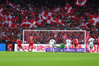 Toluca, Estado de México, 18 de octubre de 2025. Alexis Vega anota gol de penal a lo panenka, durante el partido correspondiente a la jornada 13 del torneo Apertura 2025 de la Liga BBVA MX, entre los Diablos Rojos del Toluca y los Gallos Blancos del Querétaro, realizado en el estadio Nemesio Diez. Foto: Imago7/ Jesús Esquivel