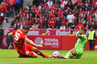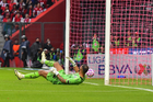 Toluca, Estado de México, 18 de octubre de 2025. Alexis Vega anota gol de penal a lo panenka a Guillermo Allison, durante el partido correspondiente a la jornada 13 del torneo Apertura 2025 de la Liga BBVA MX, entre los Diablos Rojos del Toluca y Club Querétaro, realizado en el estadio Nemesio Diez. Foto: Imago7/ Daniel Arriaga