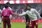 Toluca, Estado de México, 18 de octubre de 2025. Embajadora de la Campaña Rosa para la concientización del Cáncer de Mama y Alexis Vega, durante el partido correspondiente a la jornada 13 del torneo Apertura 2025 de la Liga BBVA MX, entre los Diablos Rojos del Toluca y los Gallos Blancos del Querétaro, realizado en el estadio Nemesio Diez. Foto: Imago7/ Rafael Vadillo