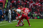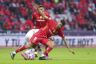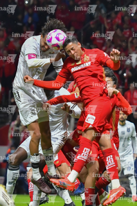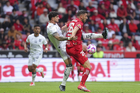 Toluca, Estado de México, 18 de octubre de 2025. Ángel Zapata y Jesús Angulo "Canelo", durante el partido correspondiente a la jornada 13 del torneo Apertura 2025 de la Liga BBVA MX, entre los Diablos Rojos del Toluca y los Gallos Blancos del Querétaro, realizado en el estadio Nemesio Diez. Foto: Imago7/ Jesús Esquivel
