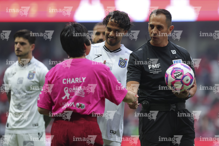Toluca, Estado de México, 18 de octubre de 2025. Embajadora de la Campaña Rosa para la concientización del Cáncer de Mama y Luis Enrique Santander, árbitro central, durante el partido correspondiente a la jornada 13 del torneo Apertura 2025 de la Liga BBVA MX, entre los Diablos Rojos del Toluca y los Gallos Blancos del Querétaro, realizado en el estadio Nemesio Diez. Foto: Imago7/ Rafael Vadillo