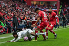 Toluca, Estado de México, 18 de octubre de 2025. Omar Mendoza comete penal a Paulinho, durante el partido correspondiente a la jornada 13 del torneo Apertura 2025 de la Liga BBVA MX, entre los Diablos Rojos del Toluca y los Gallos Blancos del Querétaro, realizado en el estadio Nemesio Diez. Foto: Imago7/ Rafael Vadillo