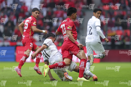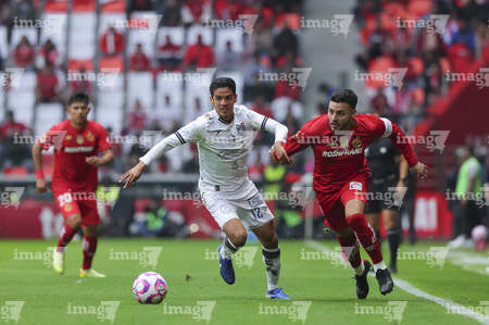 Toluca, Estado de México, 18 de octubre de 2025. Jesús Gallardo y Jaime Gómez, durante el partido correspondiente a la jornada 13 del torneo Apertura 2025 de la Liga BBVA MX, entre los Diablos Rojos del Toluca y los Gallos Blancos del Querétaro, realizado en el estadio Nemesio Diez. Foto: Imago7/ Arturo Hernandez