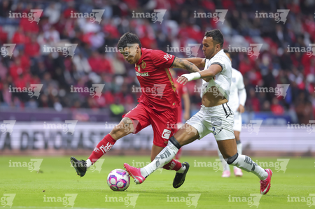 Toluca, Estado de México, 18 de octubre de 2025. Alexis Vega y Guillermo Allison , durante el partido correspondiente a la jornada 13 del torneo Apertura 2025 de la Liga BBVA MX, entre los Diablos Rojos del Toluca y los Gallos Blancos del Querétaro, realizado en el estadio Nemesio Diez. Foto: Imago7/ Arturo Hernandez