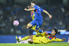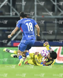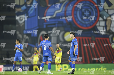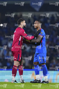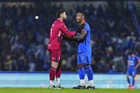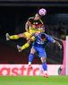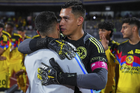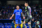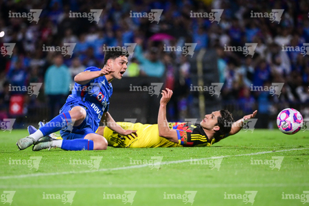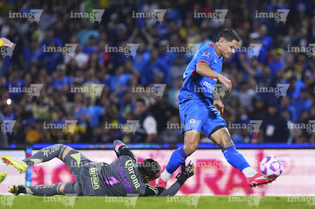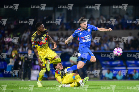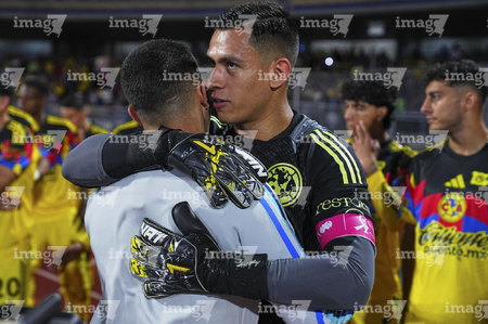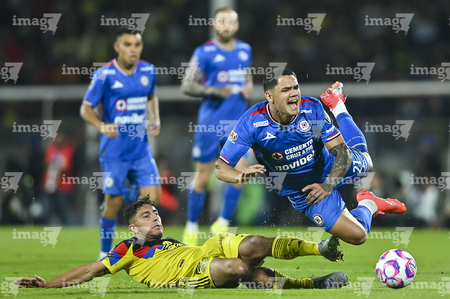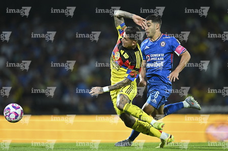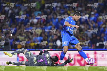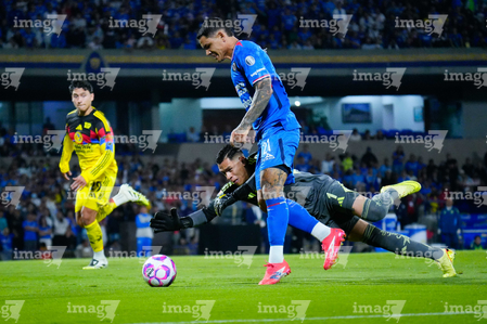 Ciudad de México, 18 de octubre de 2025. Angel Malagón y , durante el partido correspondiente a la jornada 13 del torneo Apertura 2025 de la Liga BBVA MX, entre la Máquina Celeste del Cruz Azul y las Águilas del América, realizado en el estadio Olímpico Universitario. Foto: Imago7/ Manlio Contreras