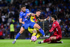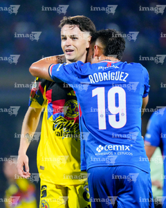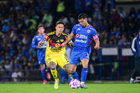 Ciudad de México, 18 de octubre de 2025. Álvaro Fidalgo y Carlos Rodríguez, durante el partido correspondiente a la jornada 13 del torneo Apertura 2025 de la Liga BBVA MX, entre la Máquina Celeste del Cruz Azul y las Águilas del América, realizado en el estadio Olímpico Universitario. Foto: Imago7/Diego Padilla
