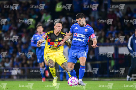 Ciudad de México, 18 de octubre de 2025. José Paradela y Cristian Borja, durante el partido correspondiente a la jornada 13 del torneo Apertura 2025 de la Liga BBVA MX, entre la Máquina Celeste del Cruz Azul y las Águilas del América, realizado en el estadio Olímpico Universitario. Foto: Imago7/ Alexis Chavez